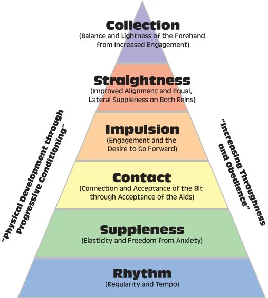 Introduce green horses & riders to competition, focusing on building confidence, education and foundational skills like RHYTHM, RELAXATION, SUPPLENESS, BALANCE and STRAIGHTNESS. (Pyramid of Training)